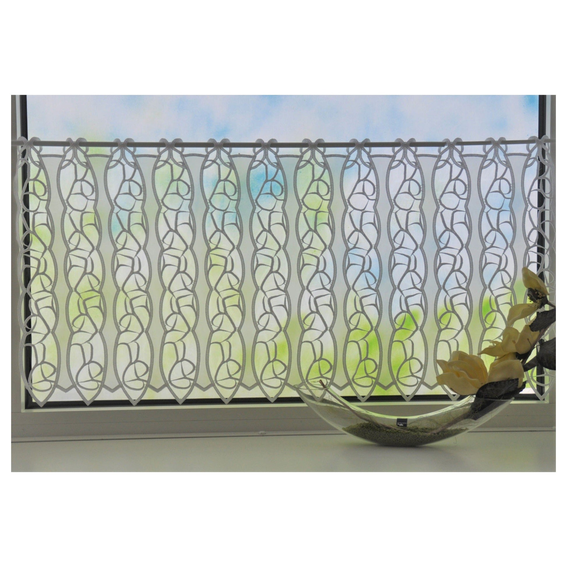 The Rome panel curtain from Stickereien Plauen stands out due to its exceptionally chic design. Due to the elegant macramé decorations, which create a net of pure beauty in the middle of the transparent voile, the curtain, which is made from genuine handcraft, is particularly translucent. The slight sheen of the polyester yarn creates a stylish ambience on your window. The easy-care material is machine washable at 30°C.