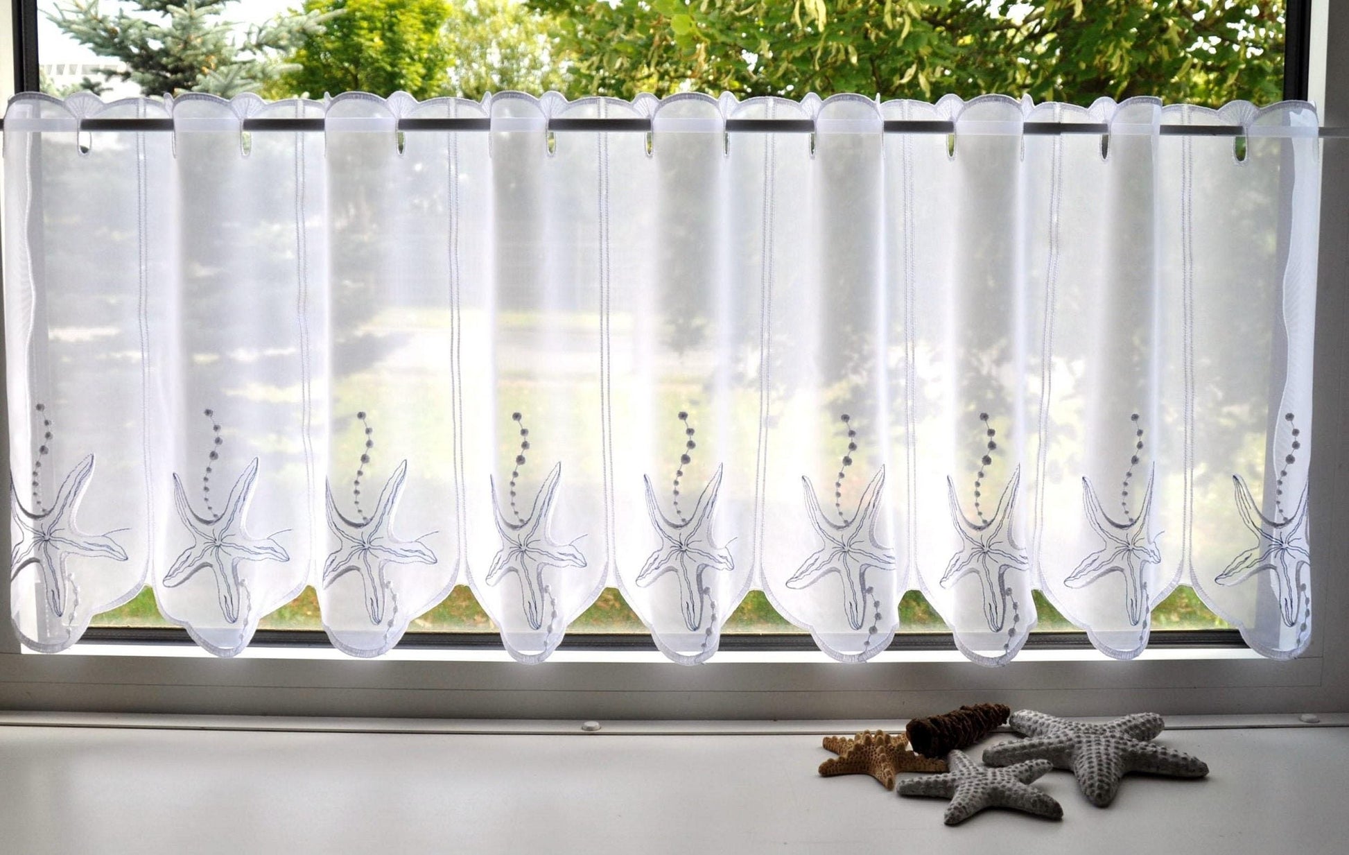 This beautiful maritime panel “Starfish” from Stickereien Plauen creates an atmospheric and natural living ambience. Real Plauen embroidery, beaded on a transparent voile ensures sufficient light. The easy-care material is machine washable. The slight sheen of the polyester yarn creates a stylish ambience on your window.